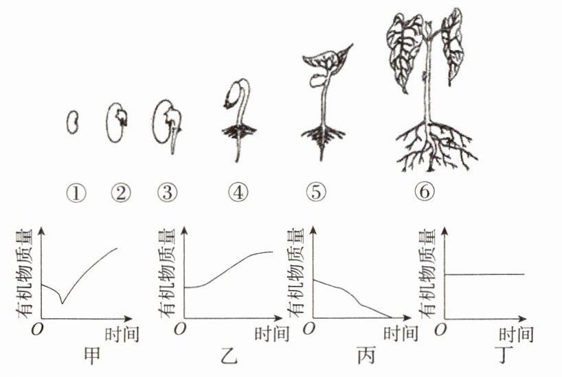 (5)下图中能表示①到⑥过程中大豆体内有机物质量变化情况的是______(填“甲”“乙”“丙”或“丁”)。图中⑤到⑥阶段,幼苗体内有机物又逐渐增加的原因是______。