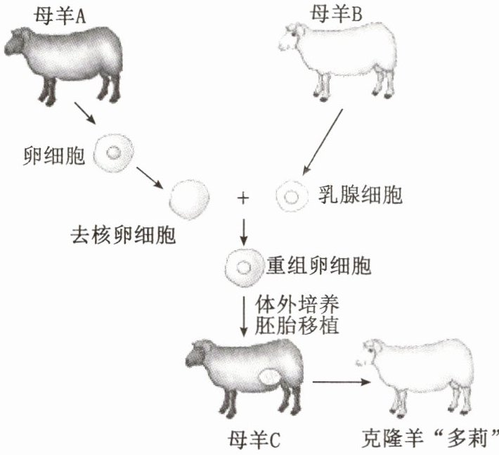 1. 从遗传角度看,“多莉”与母羊______最相似,这是因为重组卵细胞的______来自母羊B的乳腺细胞,它们细胞核中的______完全相同,所以说“多莉”是一只克隆羊。