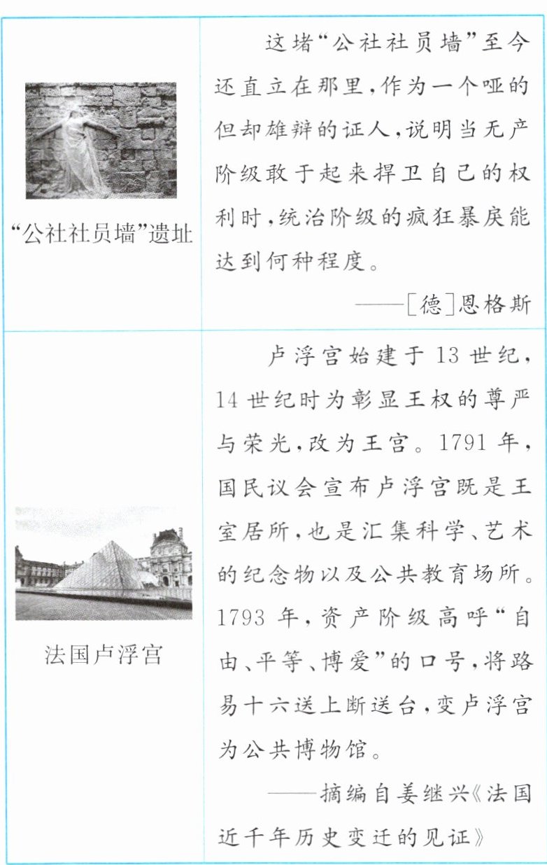 (3)城市:巴黎。【示例】历史价值:"公社社员墙"说明法国无产阶级敢于起来捍卫自己的权利,建立自己的政权。(3分)