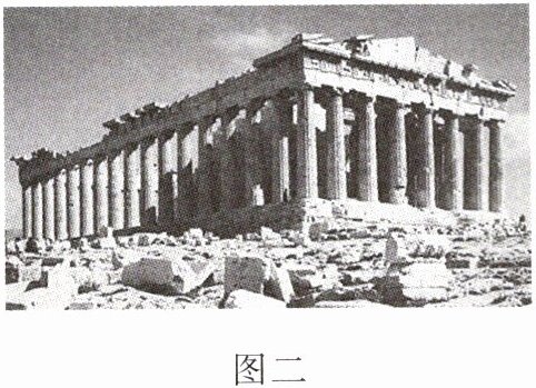 (1)古代建筑遗迹可以体现出不同风格的历史文明。图一建筑遗迹是哪一文明古国在建筑方面的成就?图二是希腊建筑艺术的典型代表,请说出它的名称。(2 分)