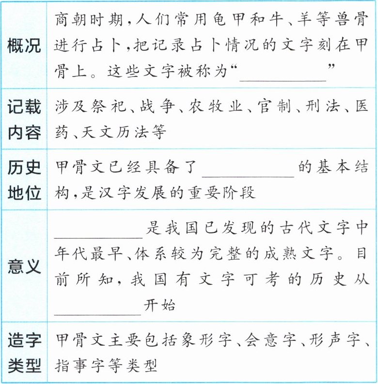 |概况|商朝时期,人们常用龟甲和牛、羊等兽骨进行占卜,把记录占卜情况的文字刻在甲骨上。这些文字被称为“______”|