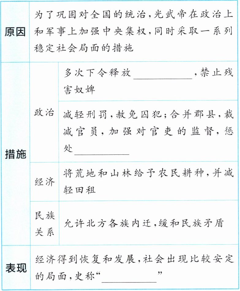 |原因|为了巩固对全国的统治,光武帝在政治上和军事上加强中央集权,同时采取一系列稳定社会局面的措施|