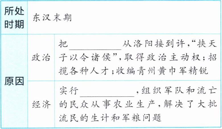 | 原因 | 政治:把______从洛阳接到许,“挟天子以令诸侯”,取得政治主动权;招揽各种人才;收编青州黄巾军精锐