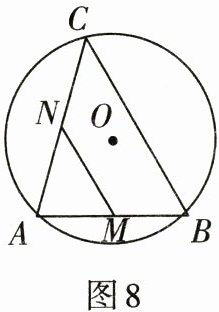 4. 如图8,AB是⊙O的弦,AB= 5,点C是⊙O上的一个动点,且∠ACB= 45°. 若点M,N分别是AB,AC的中点,则MN的最大值是