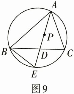 1. 已知:如图9,P是△ABC的内心,过P点作△ABC的外接圆的弦AE,交BC于D点.
