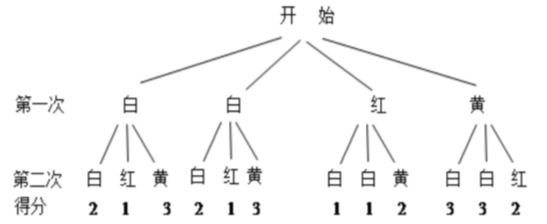 (2)若摸到红球记0分,摸到白球记1分,摸到黄球记2分,甲从口袋中摸出一个球不放回,再摸出一个.请用画树状图的方法求甲摸到两个球共得2分的概率.