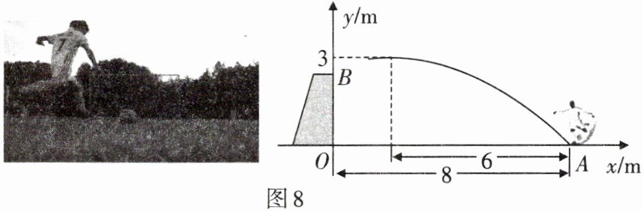 2. 一次足球训练中,小星从球门正前方8 m的A处射门,球射向球门的路线呈抛物线.当球飞行的水平距离为6 m时,球达到最高点,此时球离地面3 m.已知球门高OB为2.44 m,现以O为原点建立如图8所示直角坐标系.