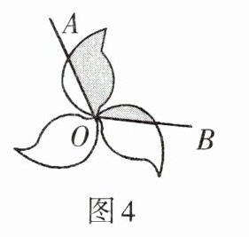 2. 如图4,上面的图案由三个叶片组成,绕点O旋转120°后可以和自身重合,若每个叶片的面积为$4 cm^2,∠AOB$为120°,则图中阴影部分的面积之和为$$