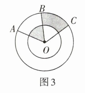 3. 如图3,两个同心圆中,大圆的半径OA= 4 cm,∠AOB= ∠BOC= 60°,则图中阴影部分的面积是$$