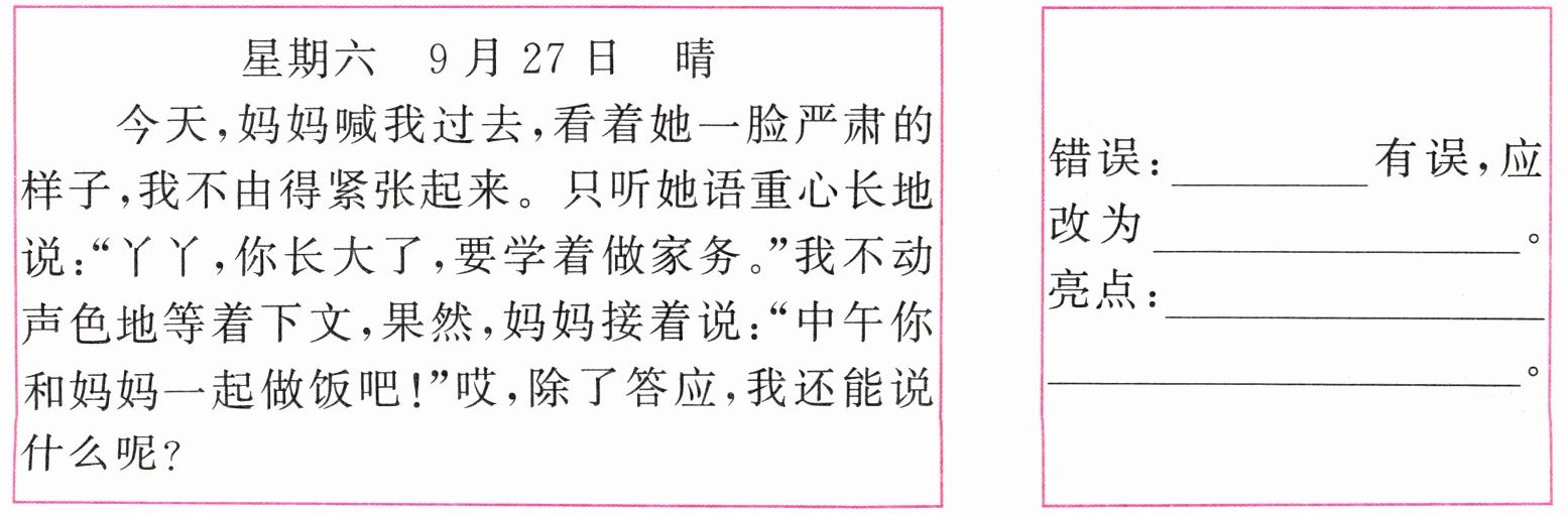 5. 下⾯的⽇记有⼀处错误和⼏处亮点,请你结合提⽰在右边的⽅框中填⼀填。
