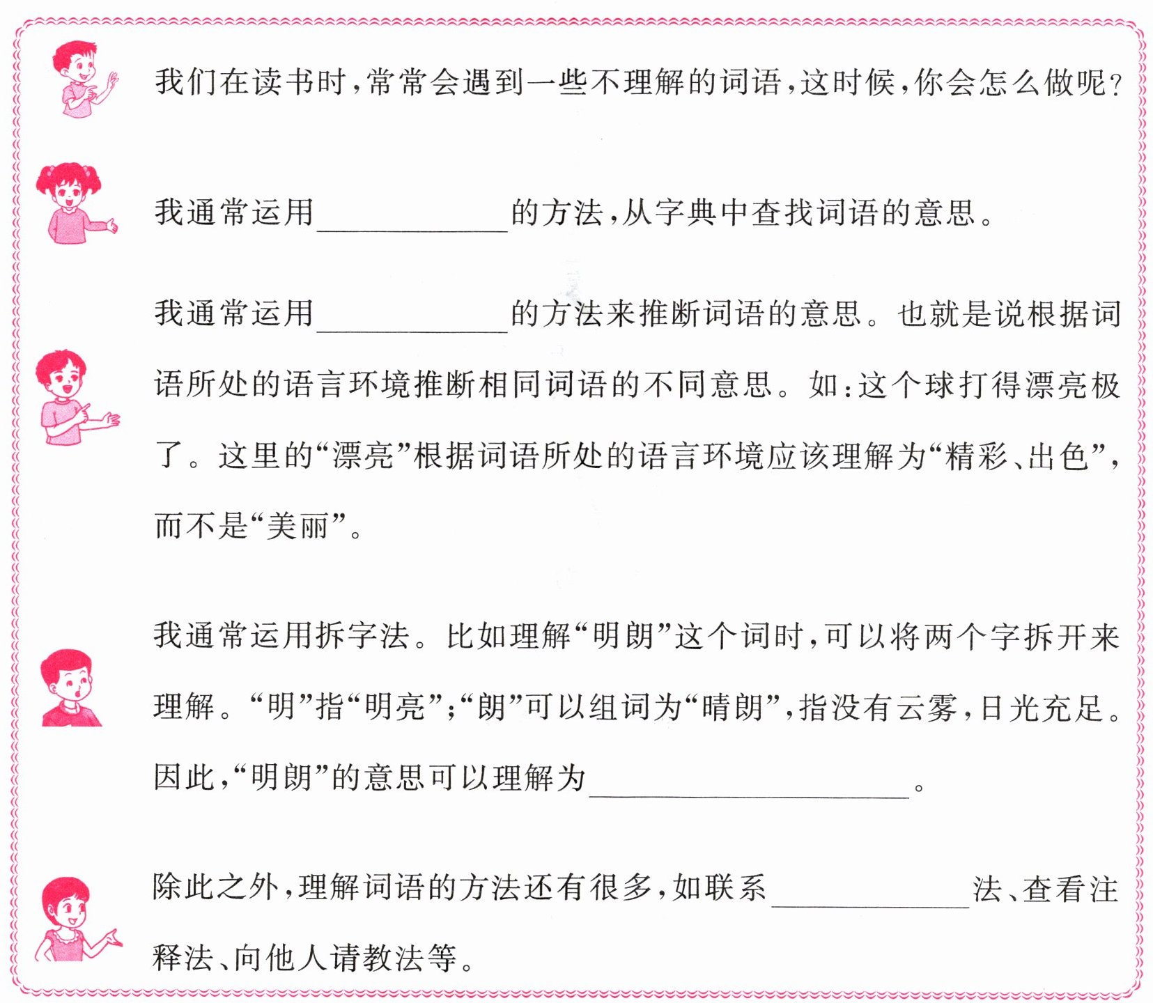 读书学习时常常会遇到一些不理解的词语,这时候,我们该怎么办呢?请加入下面同学们的讨论,试着把对话补全。