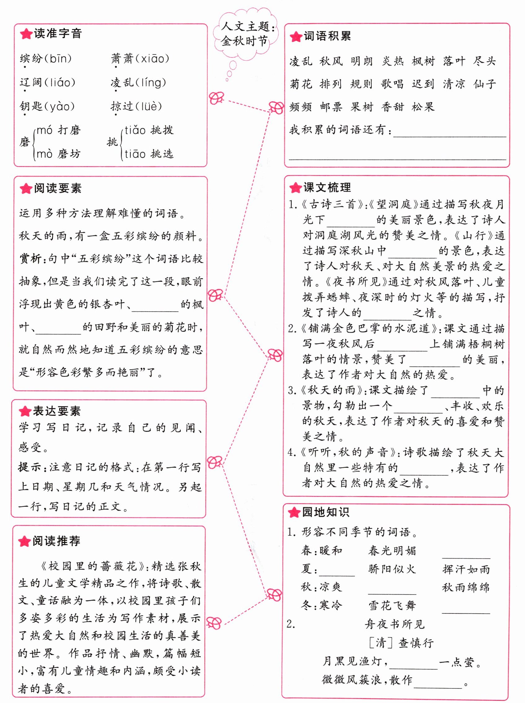 1. 《古诗三首》:《望洞庭》通过描写秋夜月光下洞庭湖的美丽景色,表达了诗人对洞庭湖风光的赞美之情。《山行》通过描写深秋山中枫林的景色,表达了诗人对秋天、对大自然美景的热爱之情。《夜书所见》通过对秋风落叶、儿童拨弄蟋蟀、夜深时的灯火等的描写,抒发了诗人的思乡之情。