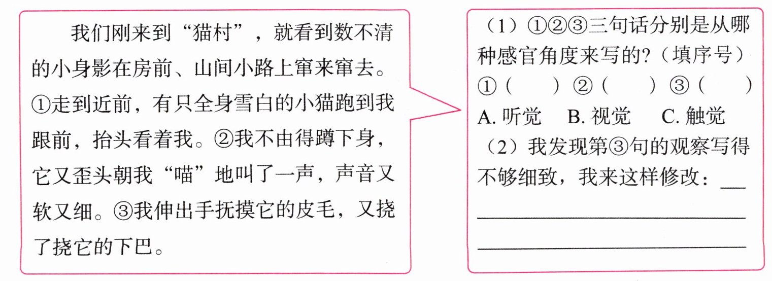 (2)示例:我伸出手轻轻抚摸它那柔软细腻的皮毛,又挠了挠它圆圆的下巴。