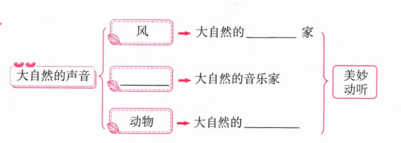 1.课文里描述的风、水、动物的声音都很具体,但作者是怎么把这些声音观察和记录下来的呢?