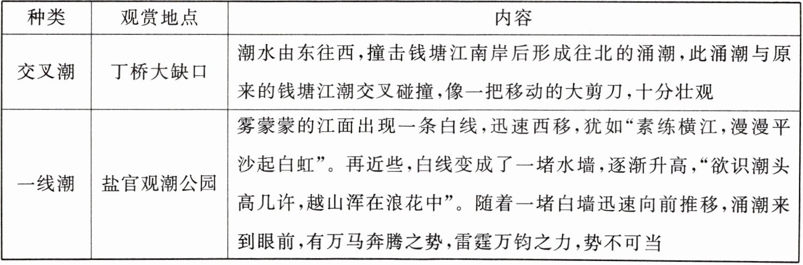 5. 拓展延伸 本节课我们了解了钱塘江大潮。从不同的地点观赏大潮, 会有不同的景象。请阅读下面的材料, 加深对大潮种类的了解。