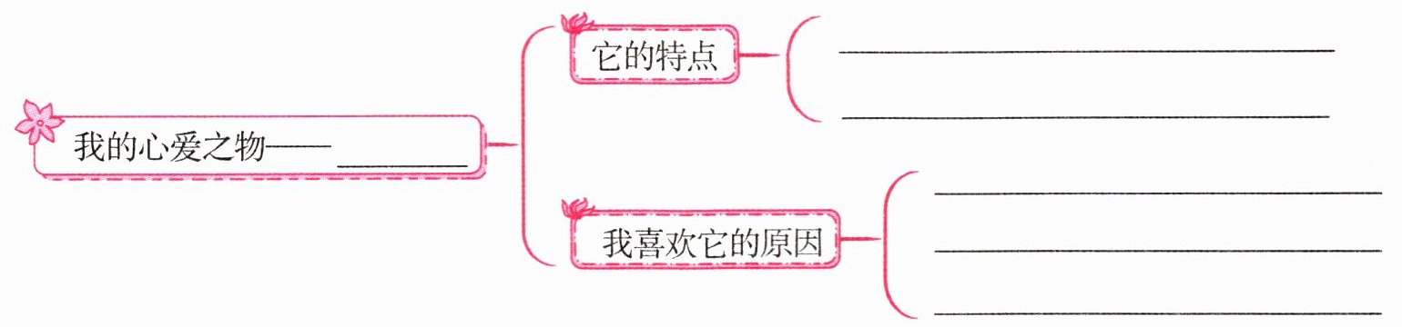 6. [习作表达]选文中,郭沫若的心爱之物是银杏。那么你的心爱之物是什么呢?如果让你围绕着“我的心爱之物”写一篇作文,你要怎么写呢?试着把下面的习作提纲补充完整。