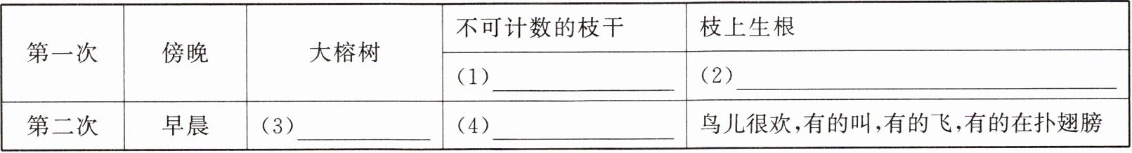 (1)垂在地上的根 (2)充满生机的绿叶 (3)群鸟飞舞 (4)到处都是鸟声,到处都是鸟影