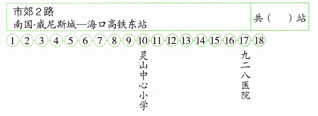 6. 迁移应用 张老师从灵山中心小学结束教学研讨,要坐市郊 2 路公交车去九二八医院看望朋友。公交车中间要停几站?