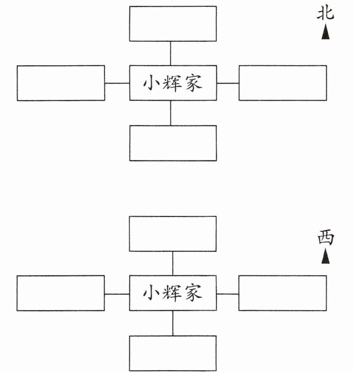 (1)小辉家的北面是小军家,南面是健身广场,东面是学校,西面是小方家,请在下面两幅图中分别标出来。