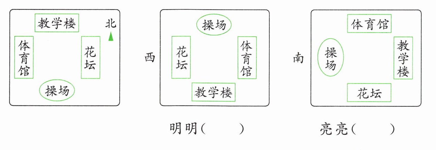 (2)左边是中心小学校园主要建筑示意图。明明和亮亮参观校园后分别画了校园主要建筑的位置图,谁画得对?请在( )里画“√”。