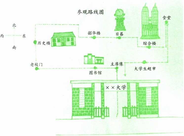 (3)你向往的大学是哪里?可以像这样绘制一份校园路线图吗?