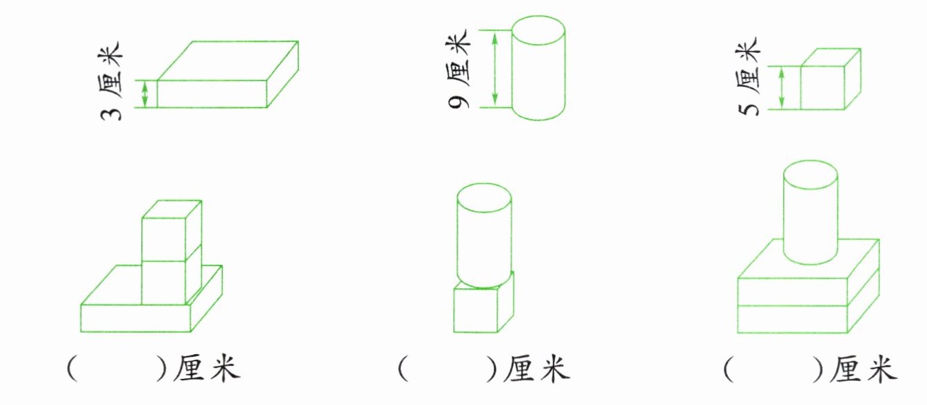 7. 下图中,用上排的三种物体搭成下排的样子,分别高多少厘米?