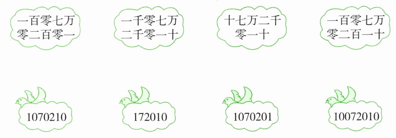2. 一百零七万零二百零一——1070201;一千零七万二千零一十——10072010;十七万二千零一十——172010;一百零七万零二百一十——1070210