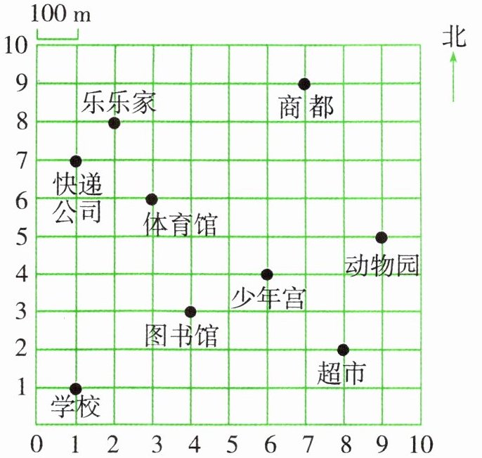(2)李林家在动物园以北200m,再往西200m处;王宁家在乐乐家以西100m,再往北100m处,请你用数对表示出李林家和王宁家的位置。