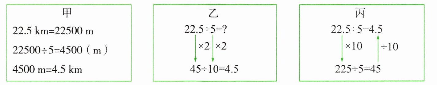 (2)动车5分钟行驶$22.5$km,平均每分钟行驶多少千米?在计算$22.5÷5$时,甲、乙、丙三位同学有不同的方法,计算正确的有(