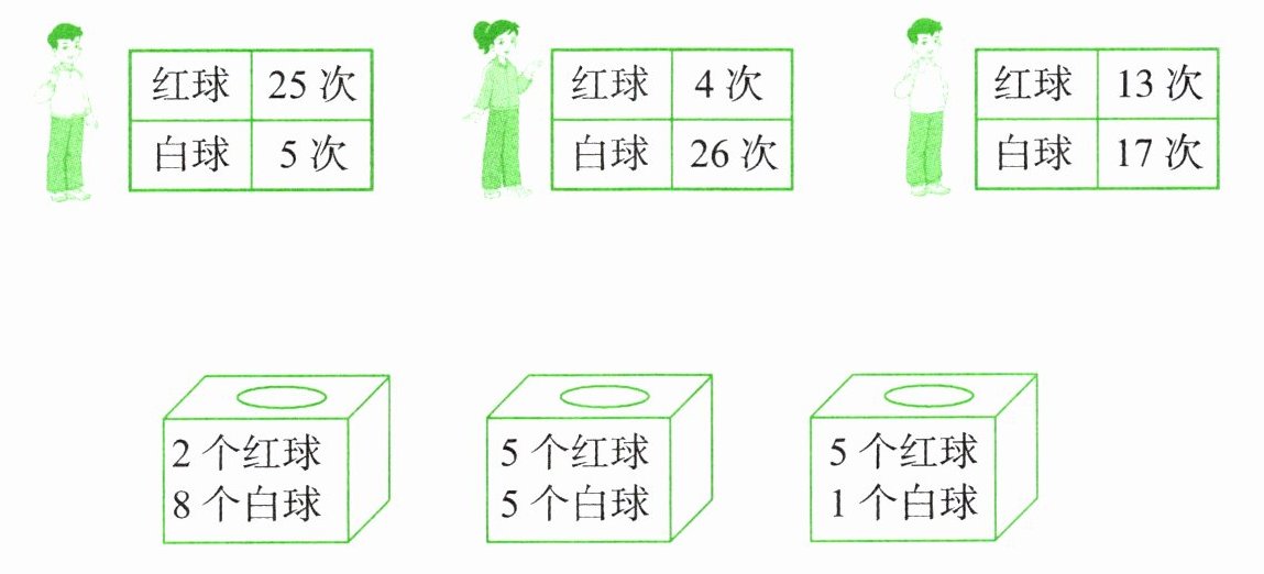 2. 有3个装有球的盒子,3位同学每次任意摸一个球,然后放回再摇匀继续摸,每人摸了30次,并把摸出的结果记录在表中。他们分别摸的可能是哪个盒子里的球?请用线连一连。