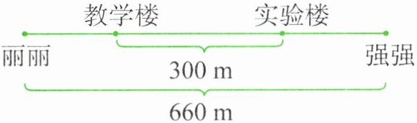7. 某学校的教学楼和实验楼相距$300\mathrm{m}$,丽丽和强强分别从教学楼和实验楼的门口同时出发,背向而行(如图),经过$3分钟两人相距660\mathrm{m}$。丽丽平均每分钟走$55\mathrm{m}$,强强平均每分钟走多少米?