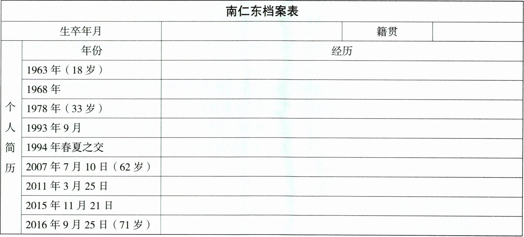 3. 结合课本中的旁批提示,圈画文中年份或表示传主年龄的词句,完善南仁东档案表。
