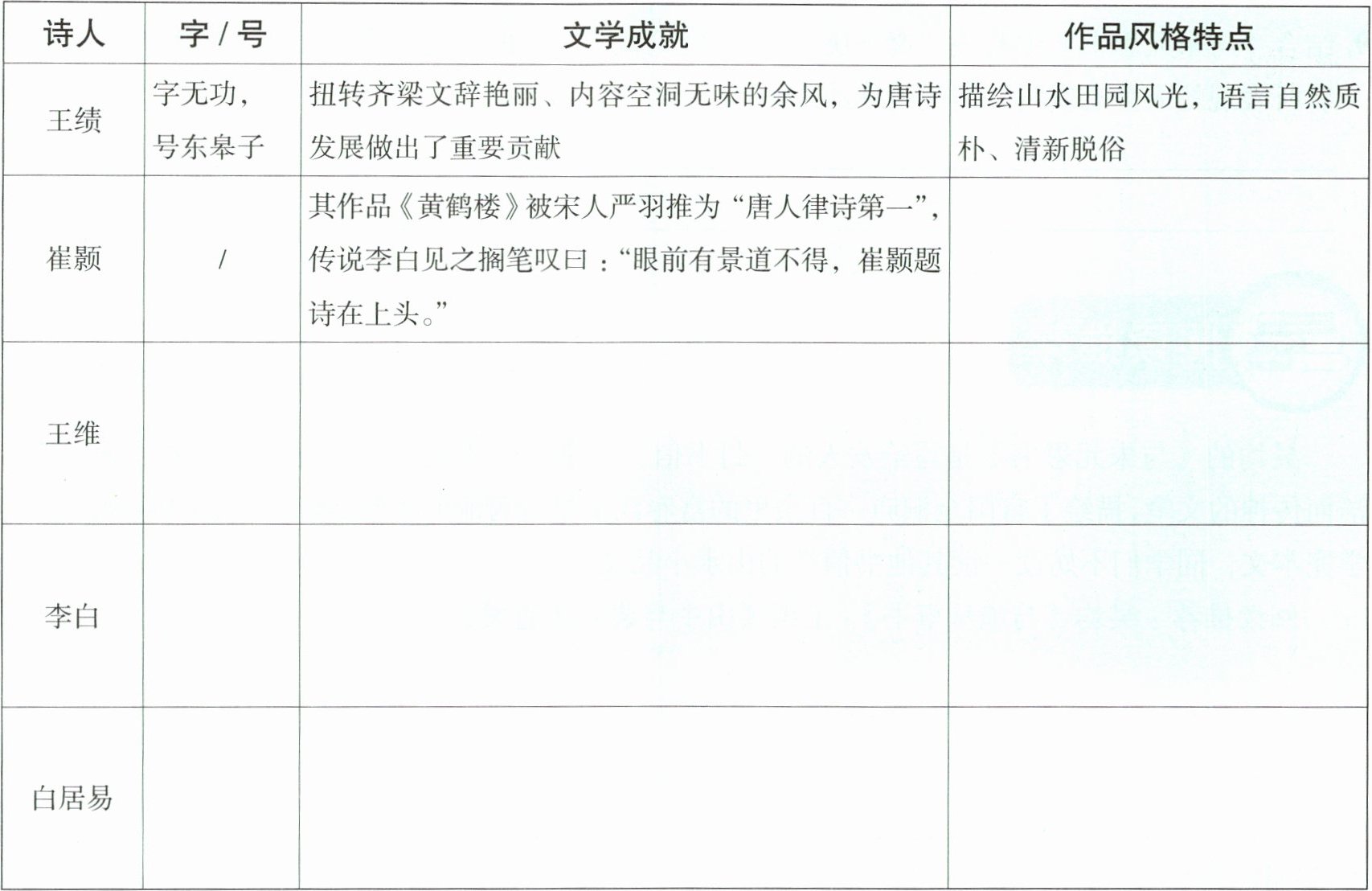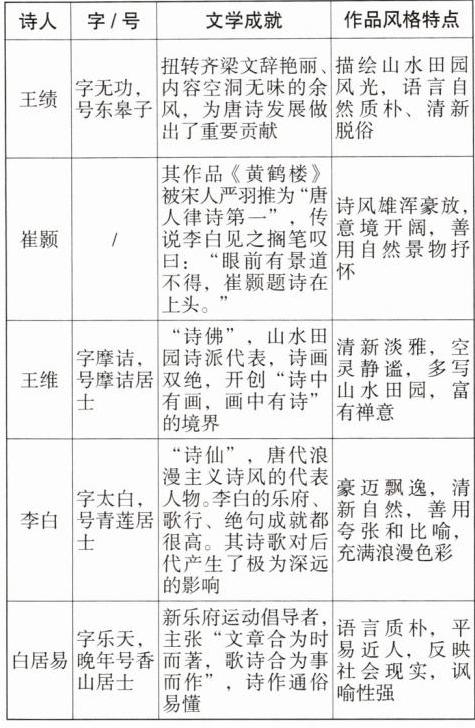 1. 查阅资料,了解五位诗人的基本信息、文学成就和作品风格特点,完成下表。