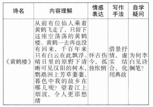 3. 任选本课一首唐诗,从内容理解、情感表达、写作手法等角度尝试自主学习,完成下表。