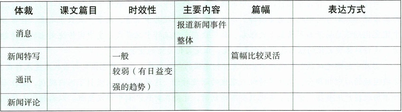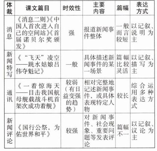 |体裁|课文篇目|时效性|主要内容|篇幅|表达方式|