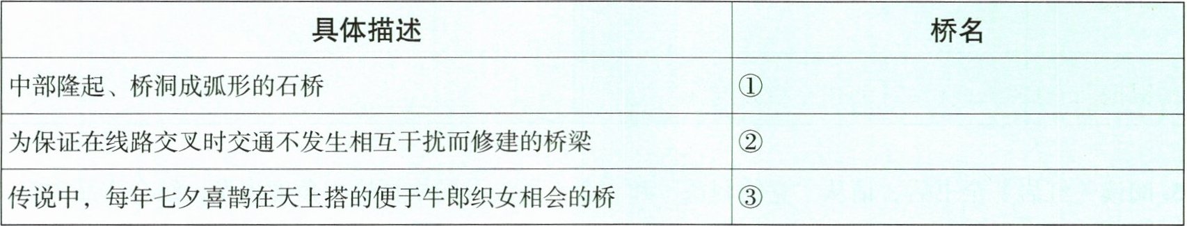 1. 桥文化丰富多彩,博大精深。为增进对桥的了解,学校开展“桥文化”综合探究活动,请你参与其中,感受桥的艺术魅力。