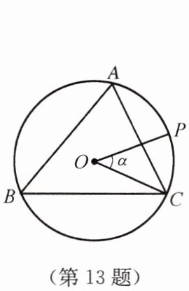 13. 如图,△ABC是⊙O的内接三角形,∠B= 50°.点P在$\overset{\frown}{CA}$上移动(点P不与点A、C重合),则α的变化范围是(