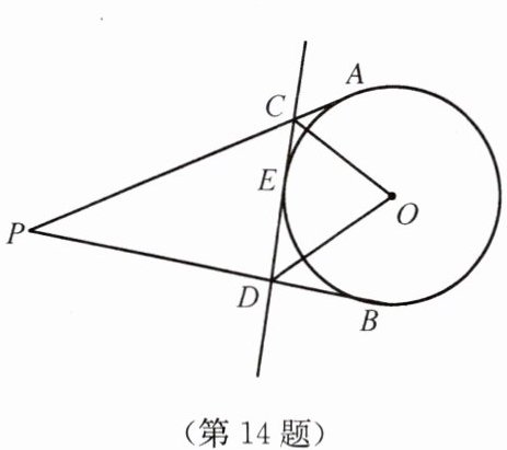 14. 如图,PA、PB、CD是⊙O的切线,切点分别为A、B、E,CD分别交PA、PB于C、D两点.已知∠APB= 40°,则∠COD的度数是(