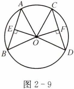 例2 如图2-9,在$\odot O$中,AB、CD是两条弦,$OE\perp AB$,$OF\perp CD$,垂足分别为E、F.