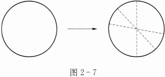 如图2-7,剪一个圆形纸片,对折后使两个半圆完全重合,重复做几次,你发现了什么?由此你能得到什么结论?