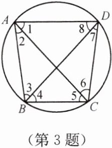 3. 如图,点A、B、C、D在同一个圆上,$AD// BC$,四边形ABCD的对角线把4个内角分成8个角,这些角中哪些是相等的角?