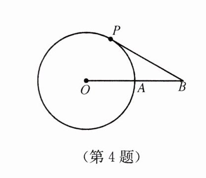 4. 如图,$\odot O$的半径是$3\ cm$,B是$\odot O$外一点,OB交$\odot O$于点A,$AB=OA$,动点P从点A出发,以$\pi\ cm/s$的速度在$\odot O$上按逆时针方向运动一周回到点A立即停止.当点P运动多少时间时,BP与$\odot O$相切?