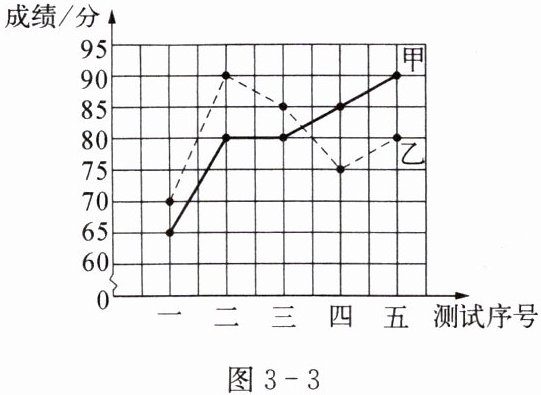 例 为了从甲、乙两名学生中选拔一人参加科普知识竞赛,赛前对他们进行了5次培训,5次培训测试的成绩如图3-3所示.