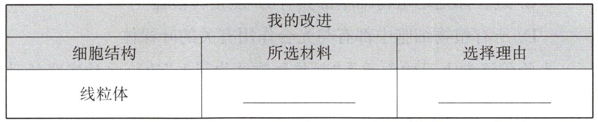 。(4)有同学对该小组制作的模型提出了改进方案,他指出:“用刷有绿色颜料的太阳能板作为叶绿体,可以类比叶绿体将光能转化为化学能的功能。”请你根据这一思路,提出能够展示线粒体功能的模型设计方案。