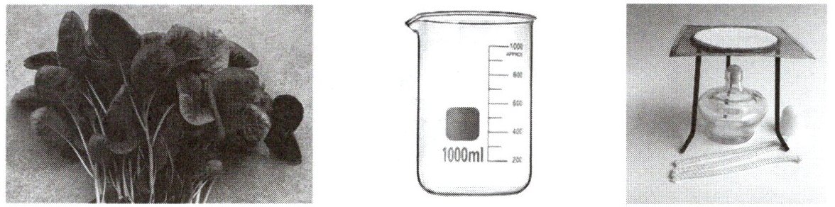实验器材:1000mL大烧杯,清水,铁架台,酒精灯,陶土网,红苋菜等。