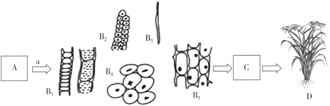 1. 若A表示细胞,经过a过程形成$B_1~B_5$几种不同形态的细胞群,则a过程为