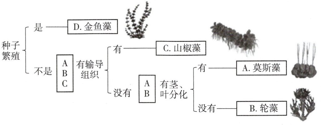10. 鱼缸造景是在热带鱼饲养与水草种植的基础上兴起的一项艺术,被称为“玻璃后面的艺术”。在造景的过程中,各种生物的贡献不可小觑。下图为金鱼藻、莫斯藻、轮藻、山椒藻这4种生物的分类图,请据图回答下列问题。