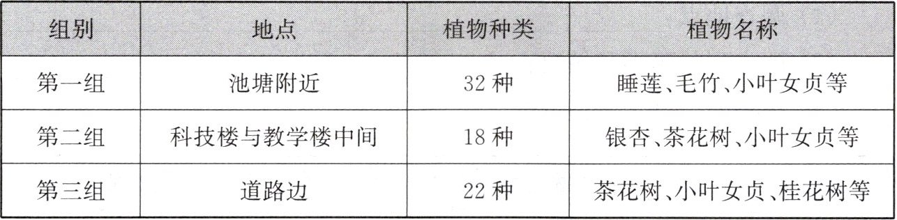 12. 为了了解校园里的植物,生物兴趣小组的同学们分成三个小组对校园内的植物种类进行研究。同学们将校园分成了三个区域,每个小组选择一个区域,对区域内的所有植物进行统计和记录。记录的表格整理如下,请据表回答下列问题。