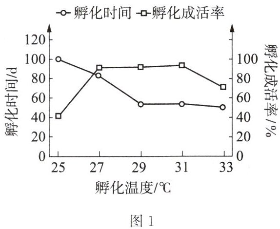 (2)据图1可知,龟卵孵化的最佳温度范围为29~31℃,原因是当温度低于29℃时,龟卵的孵化时间相对较
