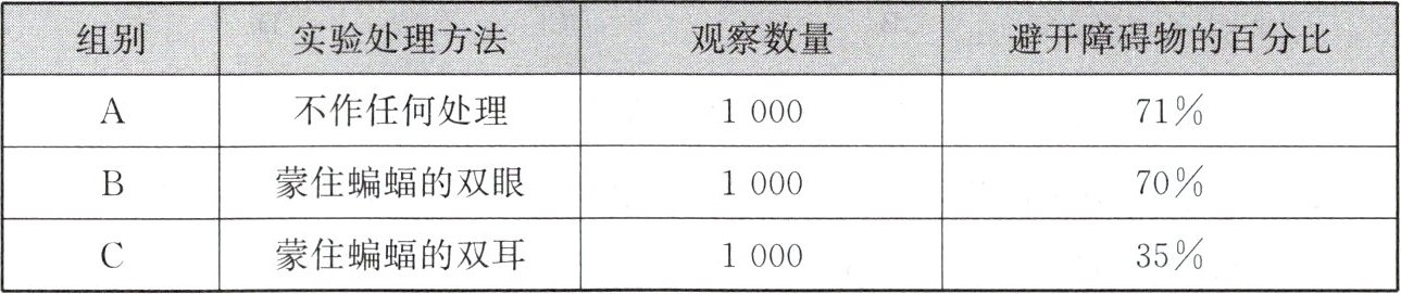 11. 为了研究“蝙蝠主要是通过什么器官来发现障碍物的”,科学家在一个大房间内竖起金属丝制成的障碍物,然后记录撞击和避开障碍物的蝙蝠数量,实验方法和结果如下表。请回答下列问题。